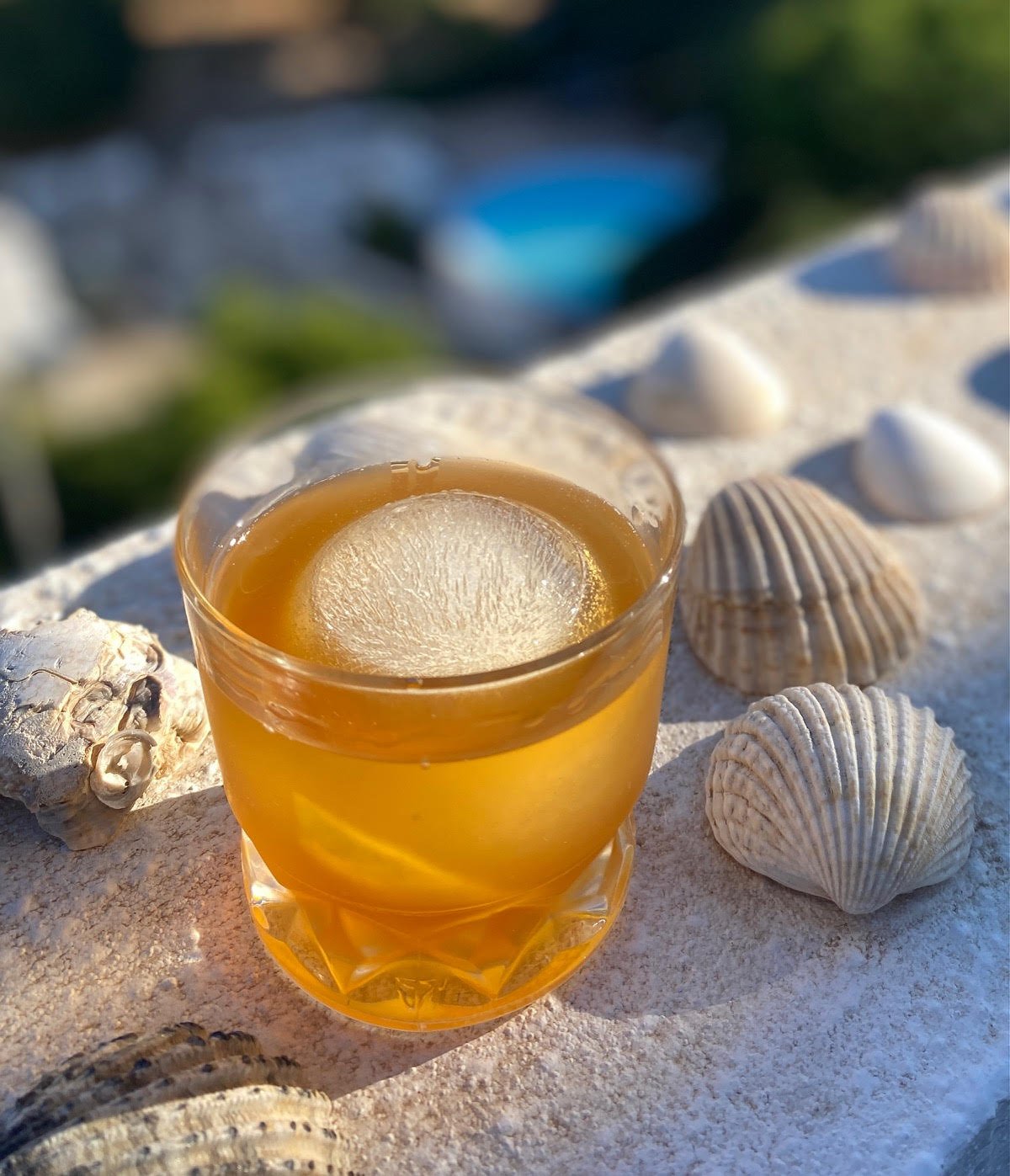 • Strain into a rocks glass with a single large ice cube or sphere.